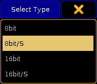 - 16bit/S: ディマー・チャンネルが16ビット・モードで制御されます。また、設定されたフェードタイムで変化した値をトリガーする追加のディマー・チャンネルを含みます。フェードタイムについては、8bit/S と同様です。