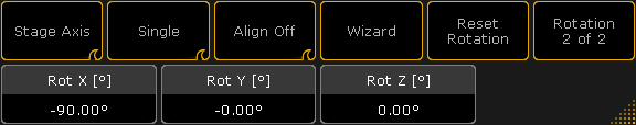 ツールバーの上部には、設定を支援する種々のボタンがあります。右端のボタンは、エンコーダのページを切り替えます。ページ1は "Position" です。ここでは、3D空間内でのフィクスチャ位置を変更できます。右端のボタンをタップすると、ページ2の "Rotation" に切り替わります。