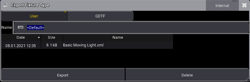 選択したドライブが Internal の場合、フィクスチャタイプは、コンピュータのローカルドライブの (C:)\ProgramData\MALightingTechnology\gma3_library\fixturetypes にエクスポートされます。