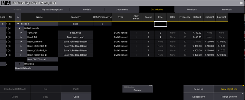 DMXチャンネルとDMXモードが、ジオメトリにリンクされます。