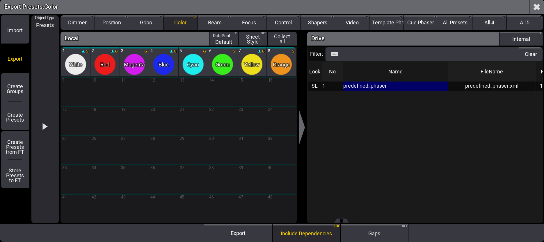 Export および Import メニューのメイン領域には、左側にデータのソースが、右側にデスティネーションが表示されます。したがって、Export メニューでは、現在のショーファイルから指定されたオブジェクト・タイプが左側の Local という領域に表示され、選択したドライブにある関連フォルダの内容が右側の Drive という領域に表示されます。Import メニューでは、これら2つの領域が反対側に表示されます。