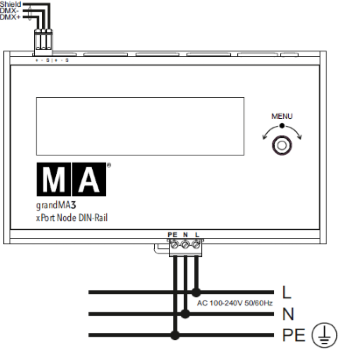 grandMA3 xPort Node DIN-Rail は、入力端子が下側、DMX端子が上側になるように、水平に取り付けてください。