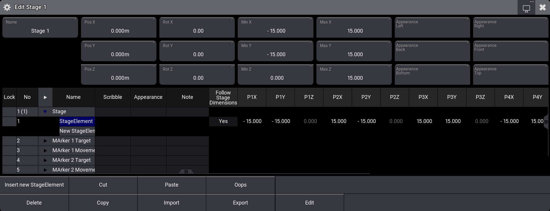 新規ステージの標準サイズは、幅(X)と奥行き(Y)が30mで中央が0になります。高さ(Z)は0〜15mです。