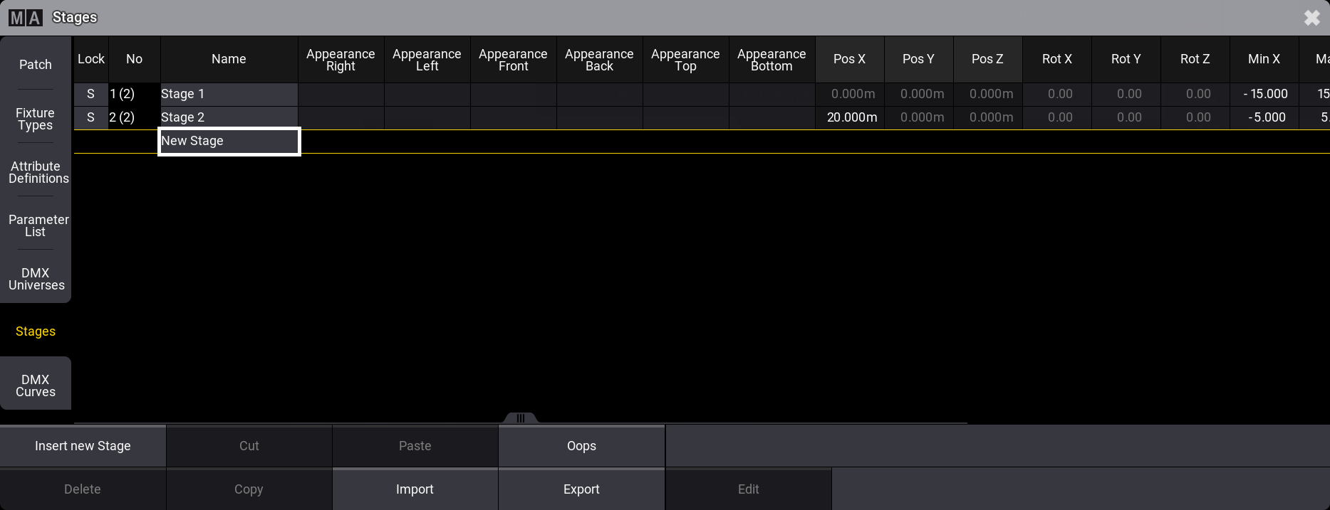 ステージは、エクスポート/インポートすることも可能です。ステージにはフィクスチャが含まれていることに注意してください。エクスポートされたステージ・オブジェクトには、パッチされたフィクスチャと、ステージ内の他のステージ・オブジェクトが含まれます。