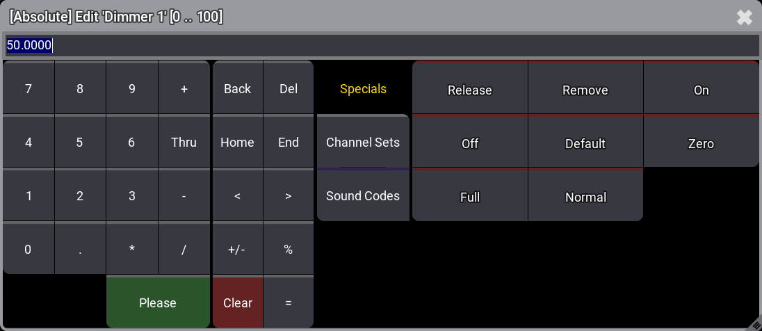 複数のフィクスチャを選択している場合、'Thru' を用いて値の範囲を入力することもできます。'Please' をクリックすると、ポップアップが閉じます。右上隅にある 'X' をクリックして、変更を加えずに閉じることもできます。