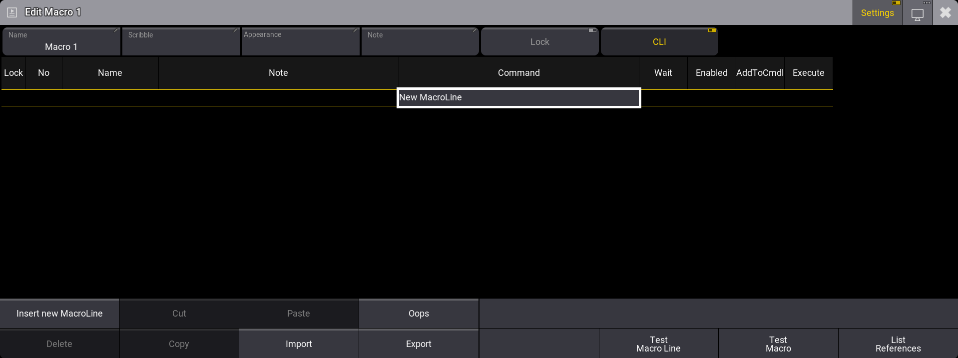 以下のような Macro Editor が表示されます。タイトルバーの 'Settings' がオンになっています。
