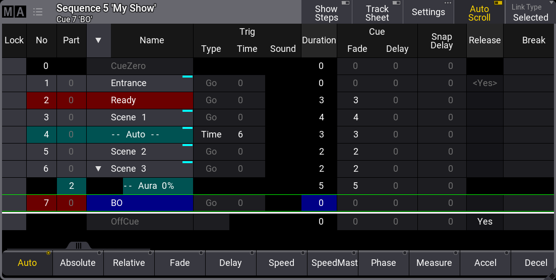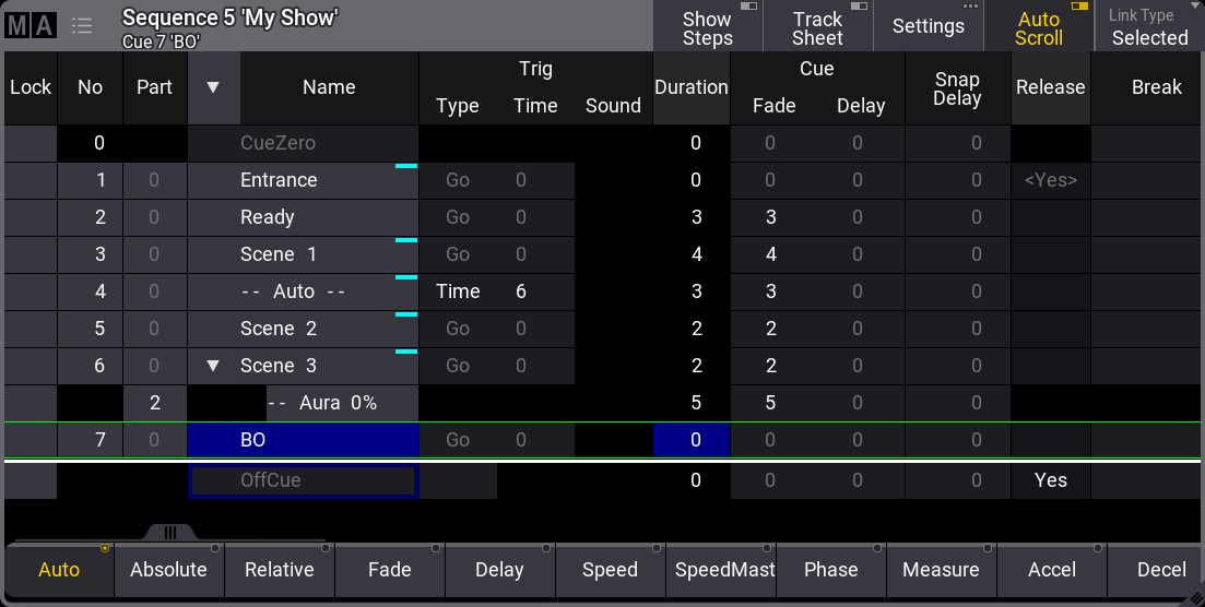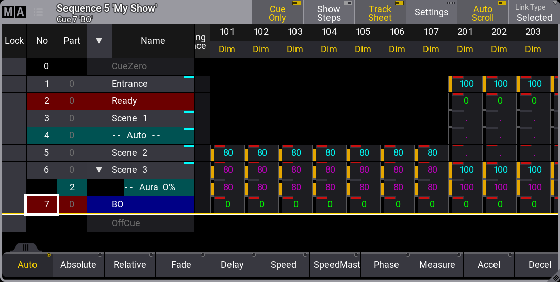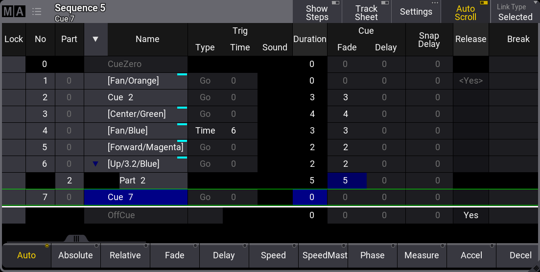 キュー6では、Mega Pointes がオン Auras をオフになるようにしました。作成したばかりなので分かっていますが、しばらくしてからこのショーに戻ると、アウトフェード・タイムを用いているのが Auras だということを思い出せないかもしれません。そこで、起こっていることがより明確になるように、別のやり方に変えてみましょう。Auras でパートキューを作成します。