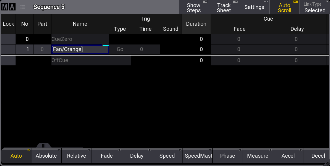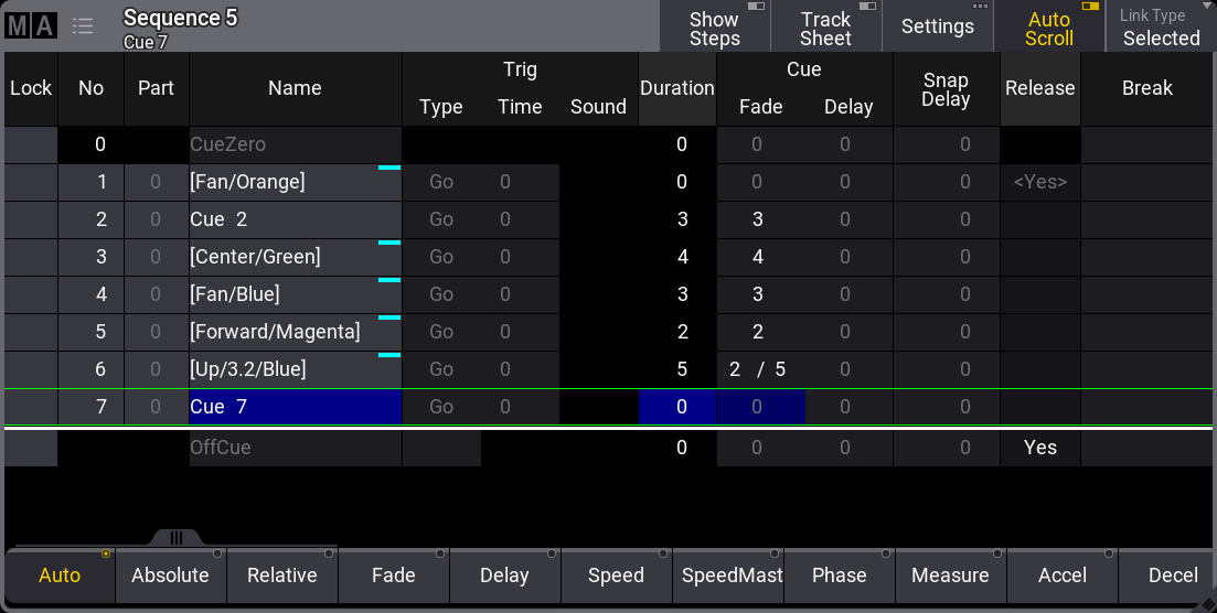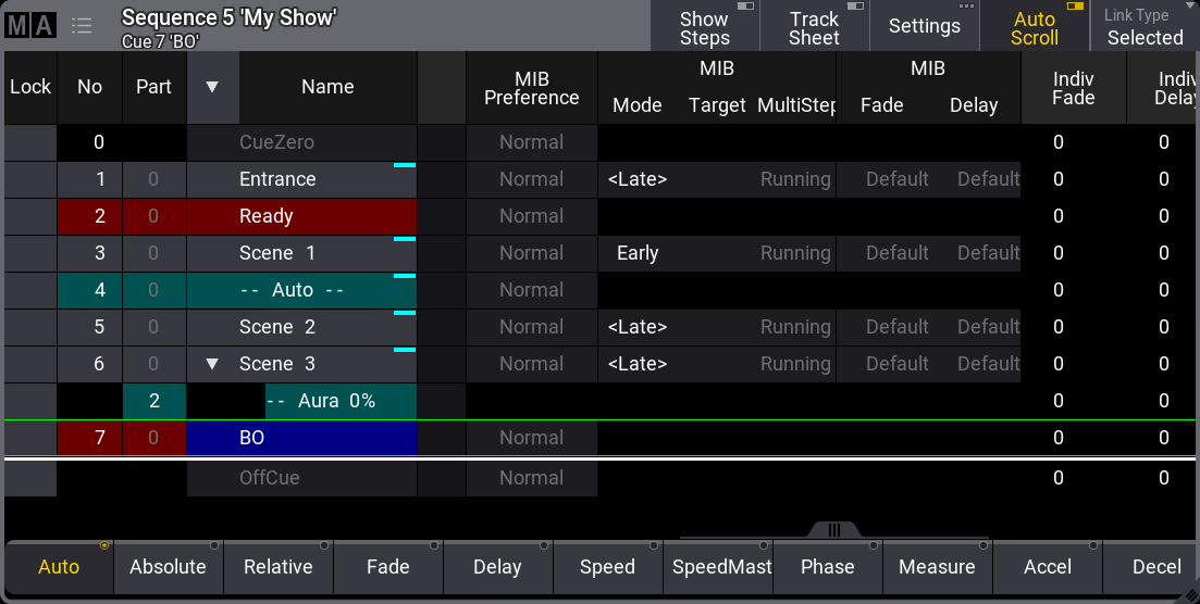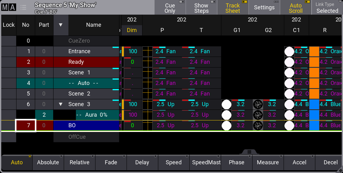 Sequence Sheet を Tracking Sheet モードに変更すると、キューに何が保存されているかを確認できます。