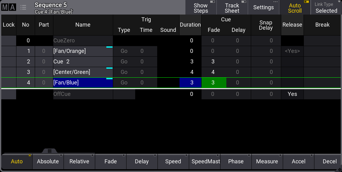 マゼンタの文字色は、トラッキング値を示しています。これは、キューには保存されていませんが、シーケンスから出力される値です。