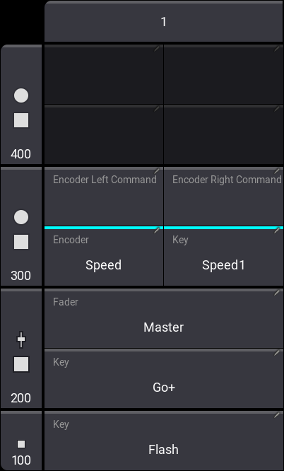 サイズ変化によって Key の割り当てが変わります。ここでも、下部のエクゼキュータ・ボタンは "Flash" にします。そして、300 ノブの Encoder を "Speed" に、300 ボタンの Key を "Speed1" にしてください。Handle の割り当ては以下のようになります。