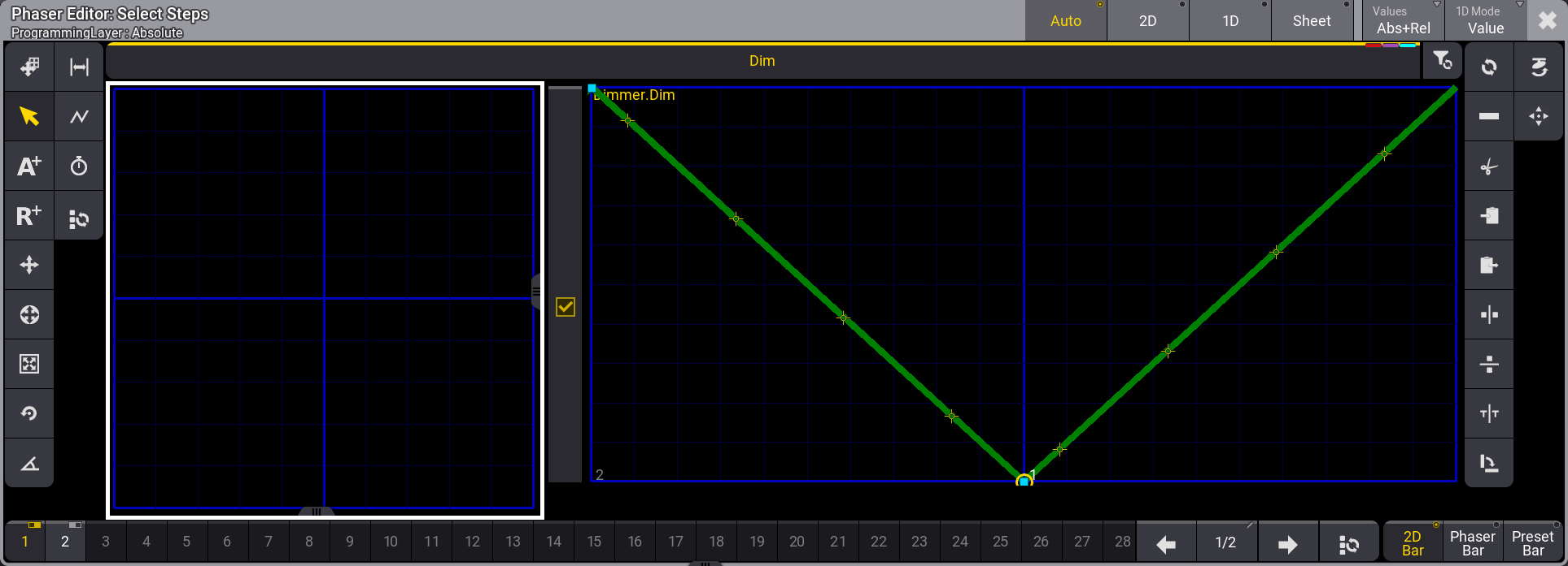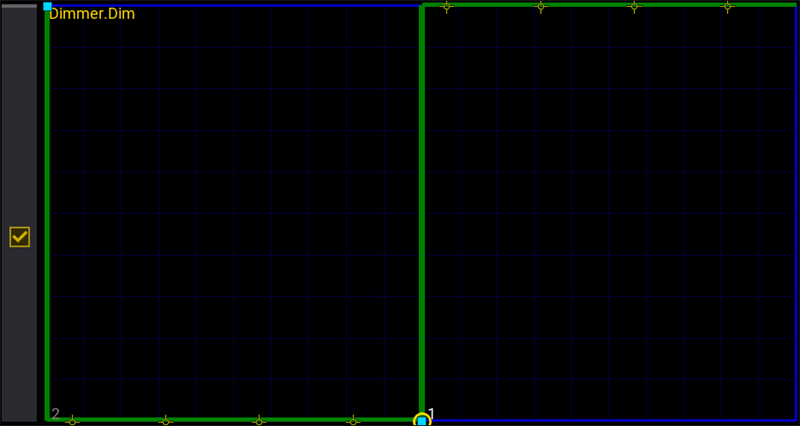 エディタに表示されている緑のV字状のラインは、2ステップ間の Dimmer 値のパスです。ステップ1はV字の下端(0%)に、ステップ2は左上端にあります。下部の青ライン上にステップ番号が表示されています。緑ラインに沿って移動する黄色のマーカは、フィクスチャのさまざまなディマー値です。