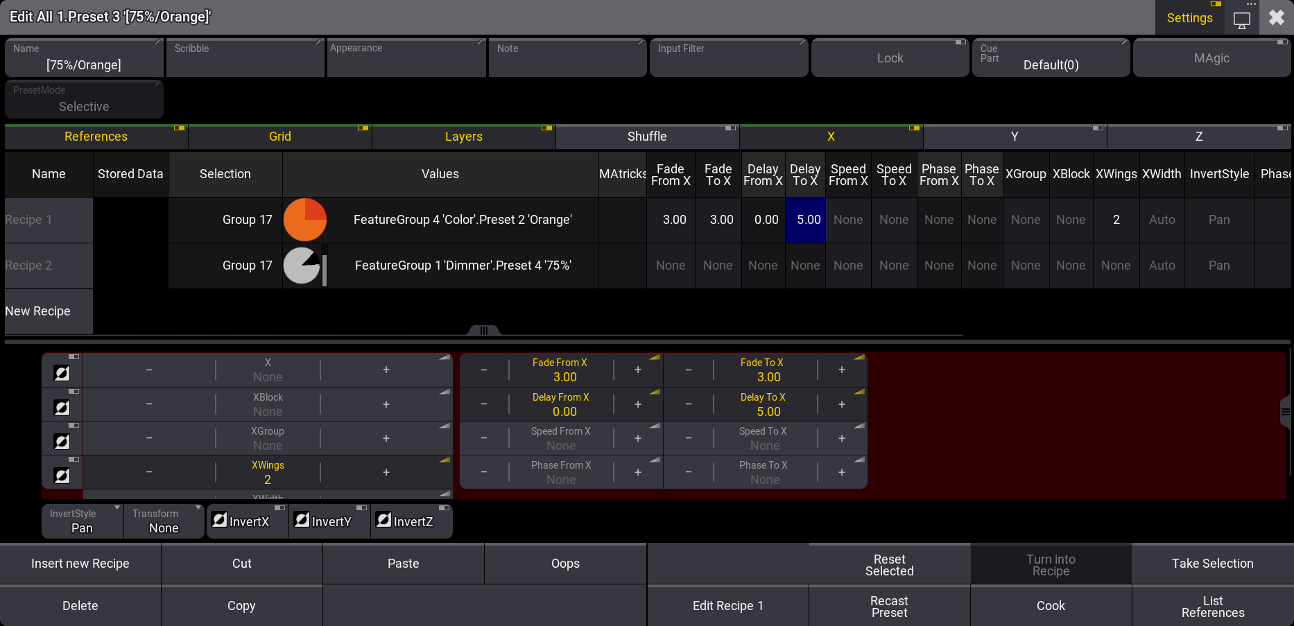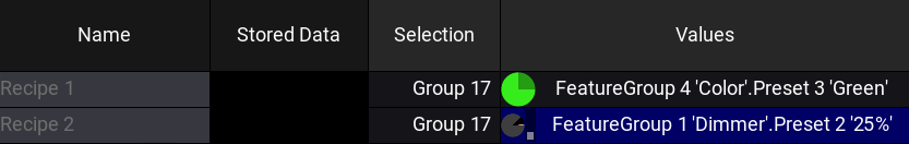 レシピ行には一連の情報を含めることができます。これには、多くの場合、フィクスチャ・セレクション(おそらくグループから)、値のセット(多くの場合プリセットから)、および値をフィクスチャに適用する方法についての情報が含まれています。この情報が、キューやプリセットに「クック(cook)」されます。