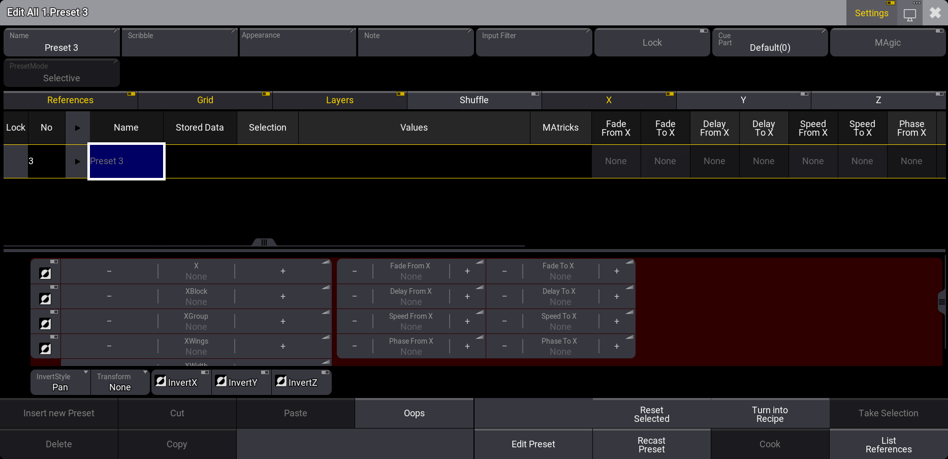 低いレベルや100%など、いくつかの Dimmer プリセットが必要です。ない場合は、これらを(Universal プリセットとして)作成してください。