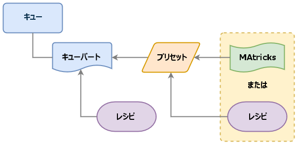 これは、レシピをキューパートやプリセットに保存し、それをキューパートで利用できることを示しています。"MAtricks" という要素もありますが、これについてはクイックスタートガイドの範囲を超えるため説明しません。