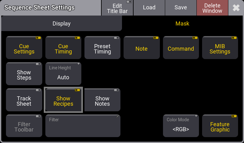 レシピ行を表示するには Sequence Sheet の設定を変更する必要があります。シートの左上隅にある MA ロゴをクリックし、Mask タブを選びます。このタブには、Sequence Sheet の外観を調整するための設定があります。Show Recipes をクリックしてオンに切り替えてください。