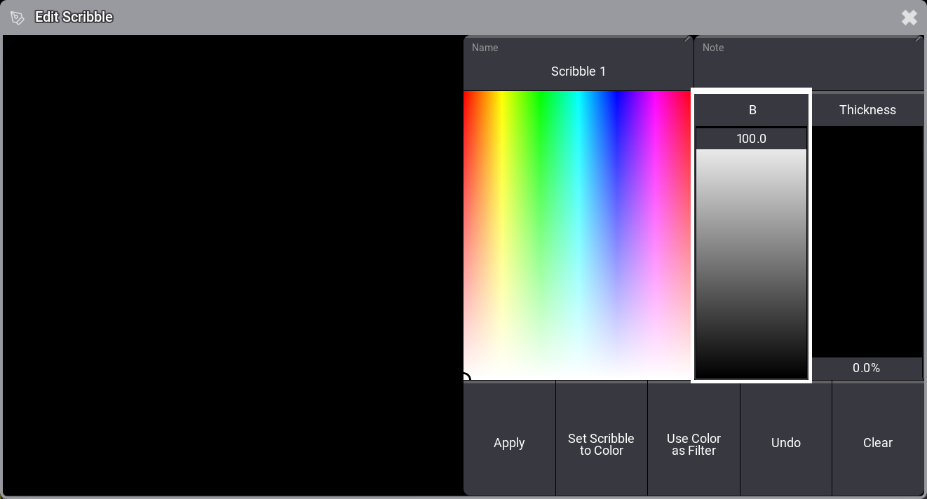 )は、スクリブルを表しています。これをクリックすると、Edit Name ポップアップの下部に Scribble Editor が開きます。ここでスクリブルを作成してオブジェクトに適用すると、それがプールにも追加され、他のオブジェクトで再利用できます。