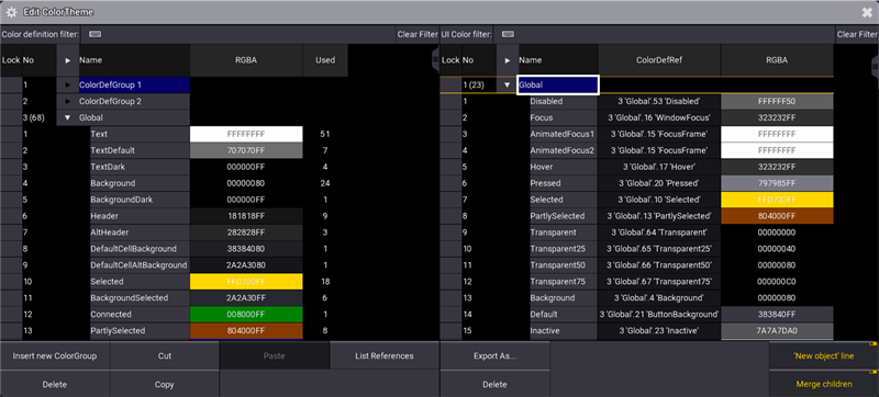 Color Theme Editor の左側には、カラー定義の一覧があります。これらは、ユーザ・インターフェース要素に対するカラー・プリセットのように機能します。カラー定義を変更すると、それらを参照しているすべてのUI要素に反映されます。この一覧には、カラー定義の名前、色の16進数値(R、G、B、アルファ値)、および各カラー定義を参照しているUI要素数が表示されます。